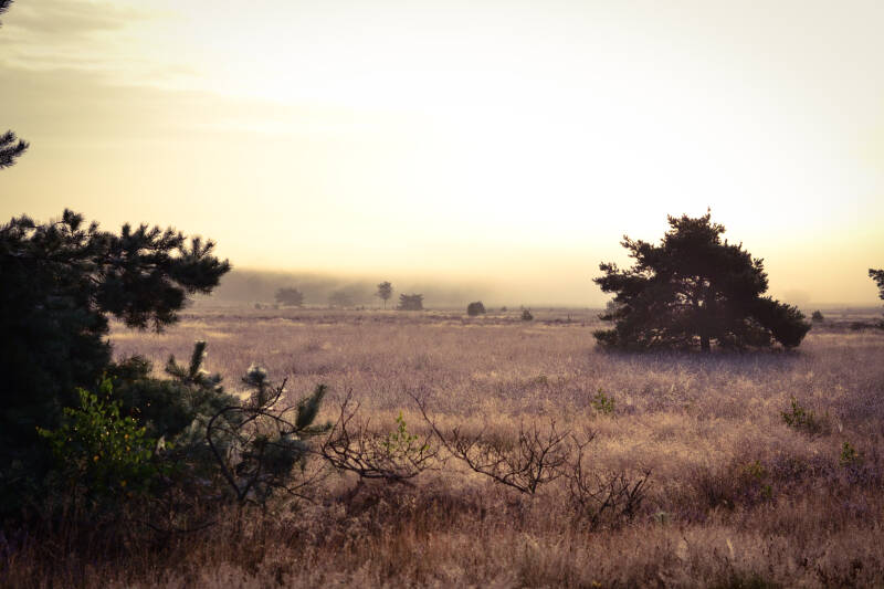 21 aug 2021 Heide fotograferen bij zonsopgang. Het begon mistig en met bewolking. Even later brak de bewolking wat open en verwarmde de zon de heide. In 2 uur tijd zo'n diversiteit aan kleur.