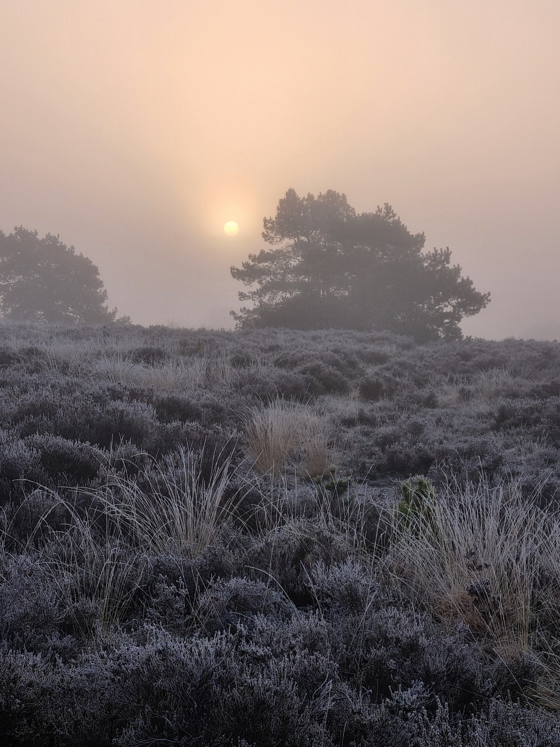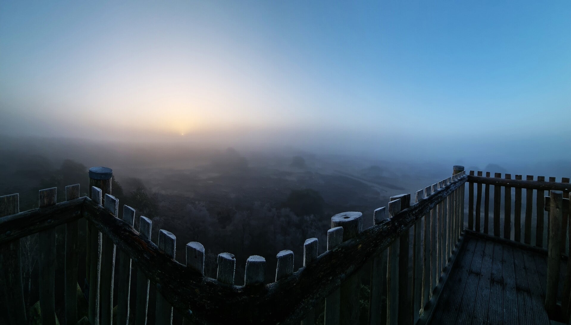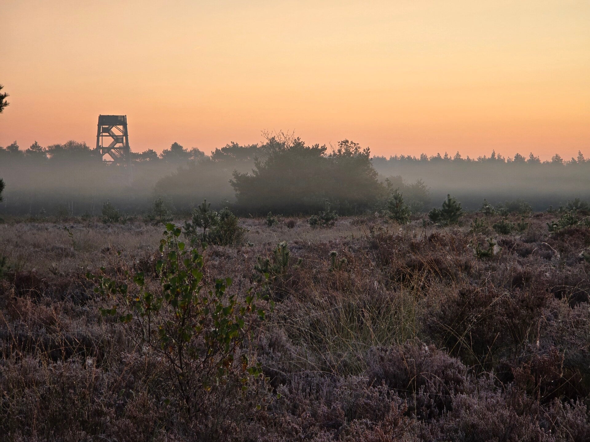 26 februari 2022; rond het vriespunt bij opkomst van de zon (07.32 uur). Stakenberg (uitkijktoren) en Elspeetse hei