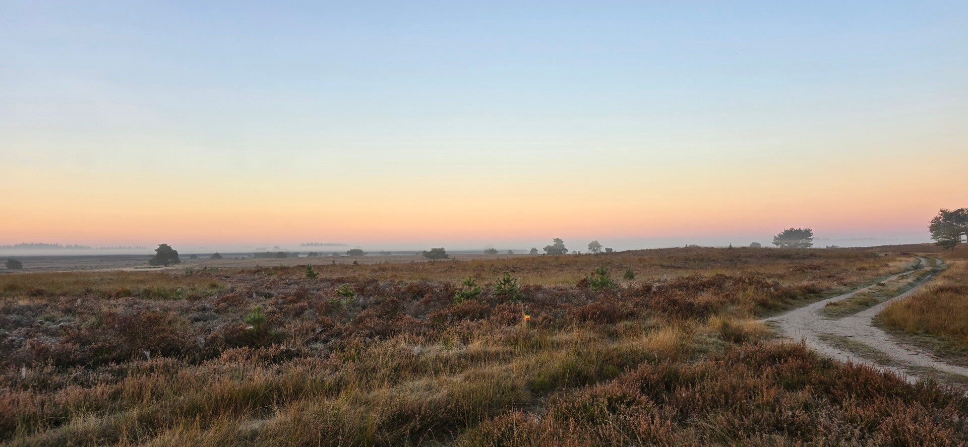 Een mooie zonsopgang op de Veluwe (okt 2024) De kleur van de lucht verschilt per minuut maar is ook afhankelijk of je richting zonsopkomst kijkt of dat je er met je rug naar toe staat.